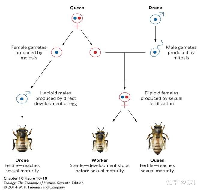 另外一个经典的有意思的例子是真社会性(eusocial)昆虫的性别比。真社会性膜翅目昆虫,比如蚂蚁,往往有一个或几个雌性的蚁后,众多的雌性工蚁,和繁殖季节婚飞的雄性公蚁,这导致雌性数量远超雄性,性别比严重地偏低,而这一般就是由亲缘选择(kin selection)解释的——因为产生的工蚁能够帮助养育更多的姐妹。既然这里那就再说一句题外话,真社会性膜翅目昆虫性别比的成因还受到很多其他因素的影响,比如不同性别后代继承的父亲与母亲基因的比例,在这一点上真社会性膜翅目昆虫是特殊的,因为蚁后和工蚁是双倍体,而公蚁是单倍体,这导致了蚁后与它的雌性后代和雄性后代之间都共享有50%的基因,而作为工具人的雌性工蚁对其他姐妹(其他工蚁和蚁后)共享有75%的基因,而对其兄弟公蚁只共享有50%的基因,而公蚁的基因100%会遗传给雌性后代,但只有50%的可能性遗传给雄性后代。所以我们看到不同的阶级有不同的利益诉求:蚁后想要两性平等,而工蚁与公蚁都希望有更多的姐妹/雌性后代。更有意思的是,各个阶级的个体可以通过自己的行为来调整性别比,比如工蚁因此会对雌性幼体关爱有加,而对公蚁的幼体照顾的不那么周到,而蚁后也会将计就计,上调公蚁的出生比例以力求两性平等 (Helantera & Ratnieks, 2009)。